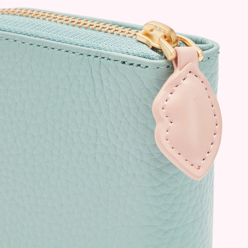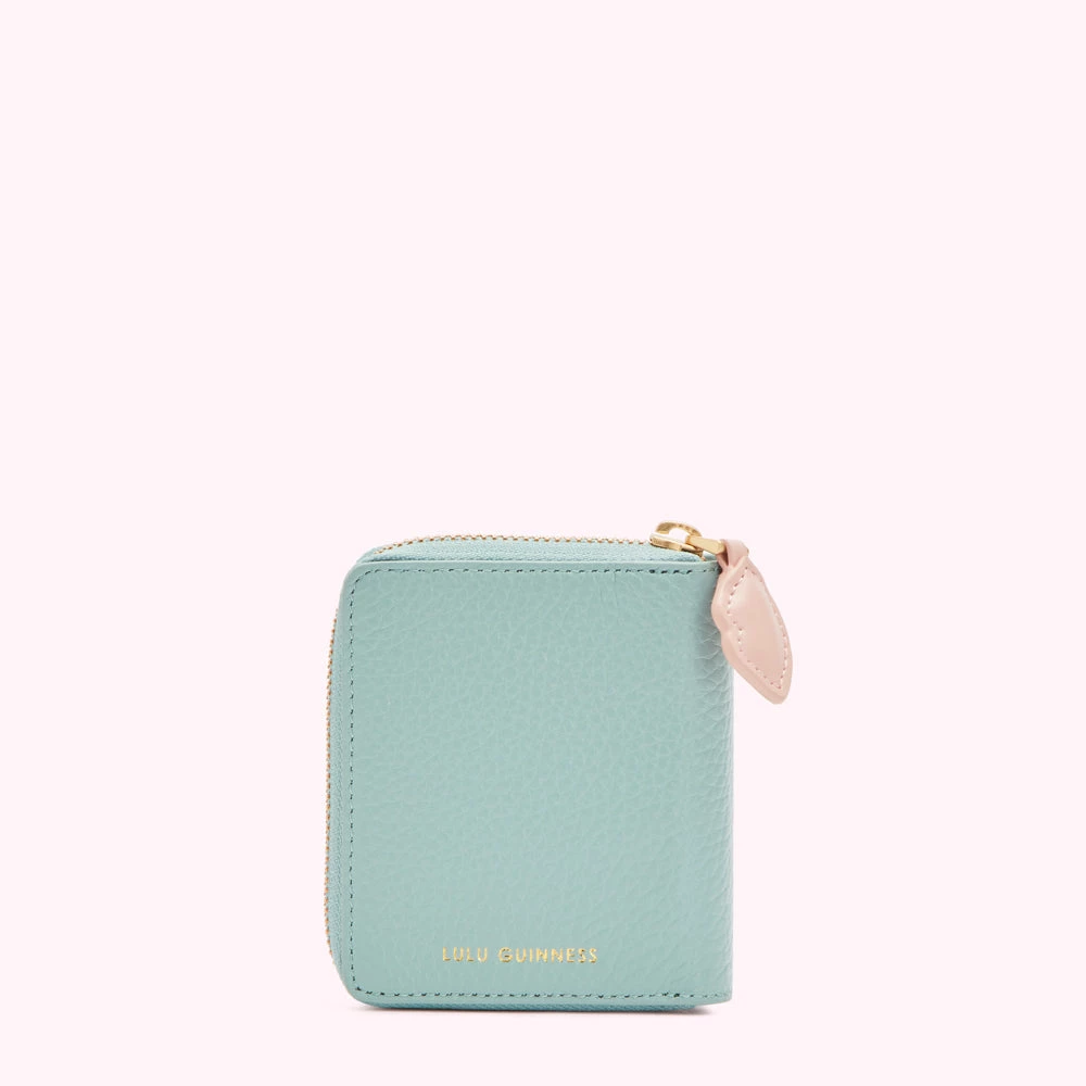 The perfect size to throw in your handbag, our grainy leather Portia wallet in Aqua will freshen up your essentials. This petite purse has interior card slots and a zip-around closure.