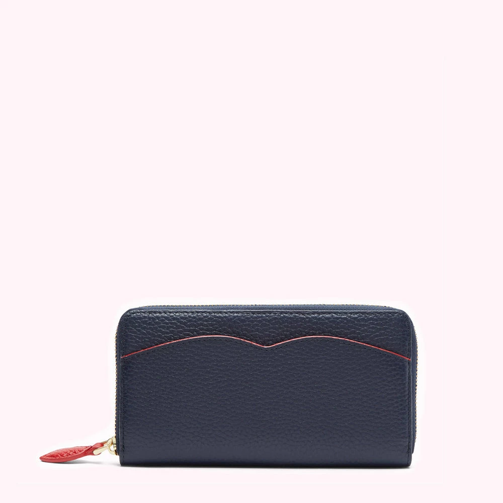 Our classic-with-a-twist Continental wallet is crafted from navy leather and features cupid’s bow slip pocket on the front with zipped closure. The signature red interior has two internal compartments and one zipped compartment for coins.