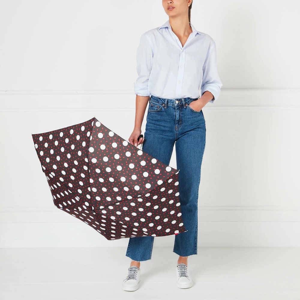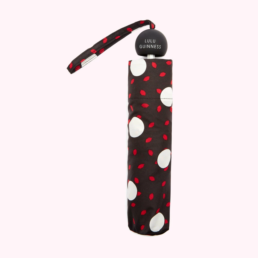 Red and black polka dot lips printed umbrella featuring a wrist strap, protective case and lightweight, compact design.