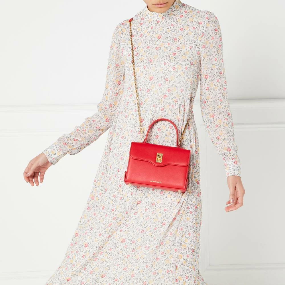 The definition of classic chic our structured Queenie handbag gives a nod to Lulu’s British heritage. Updated in signature red with an exquisite gold lip turn-lock fastening, she’s crafted from textured leather and features concertina folded sides and detachable chain so she can be worn across the body or over the shoulder.