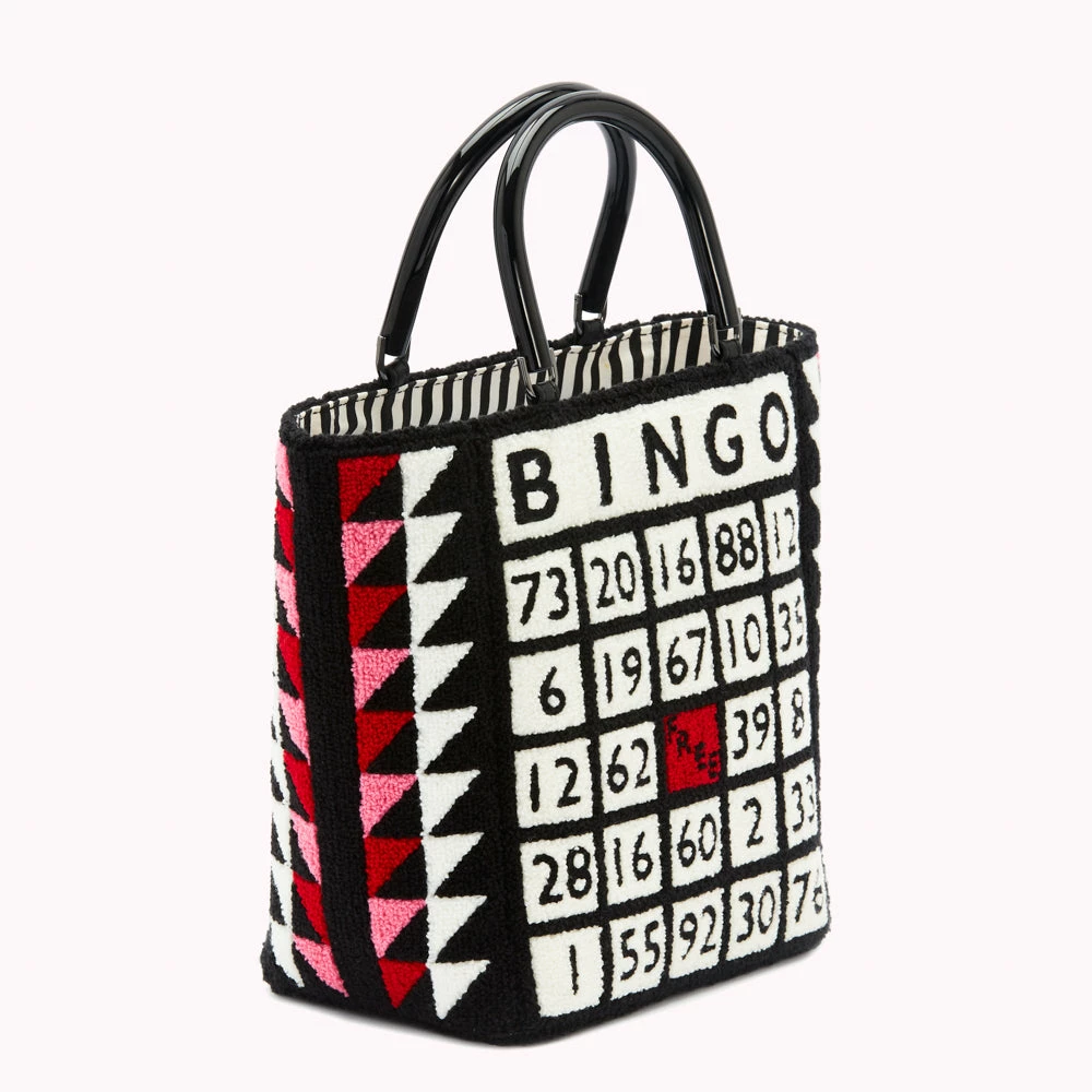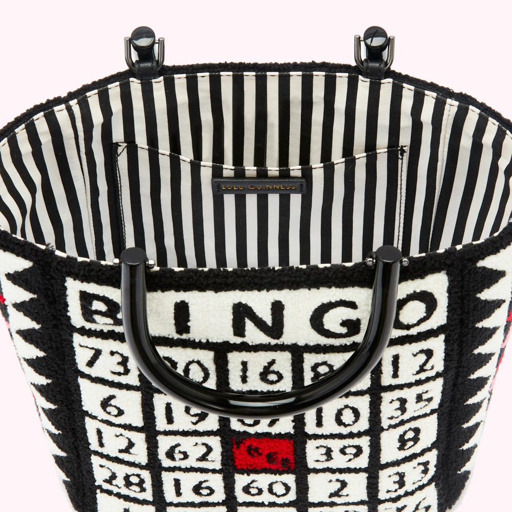 Inspired by designs from the Lulu archive, our statement Bibi tote encapsulates quintessential British charm. Crafted from soft and textured bouclé, she features Bingo board design, chic black acrylic handles, vertical stripe lining and internal slip pocket. Will you take a chance on her?
