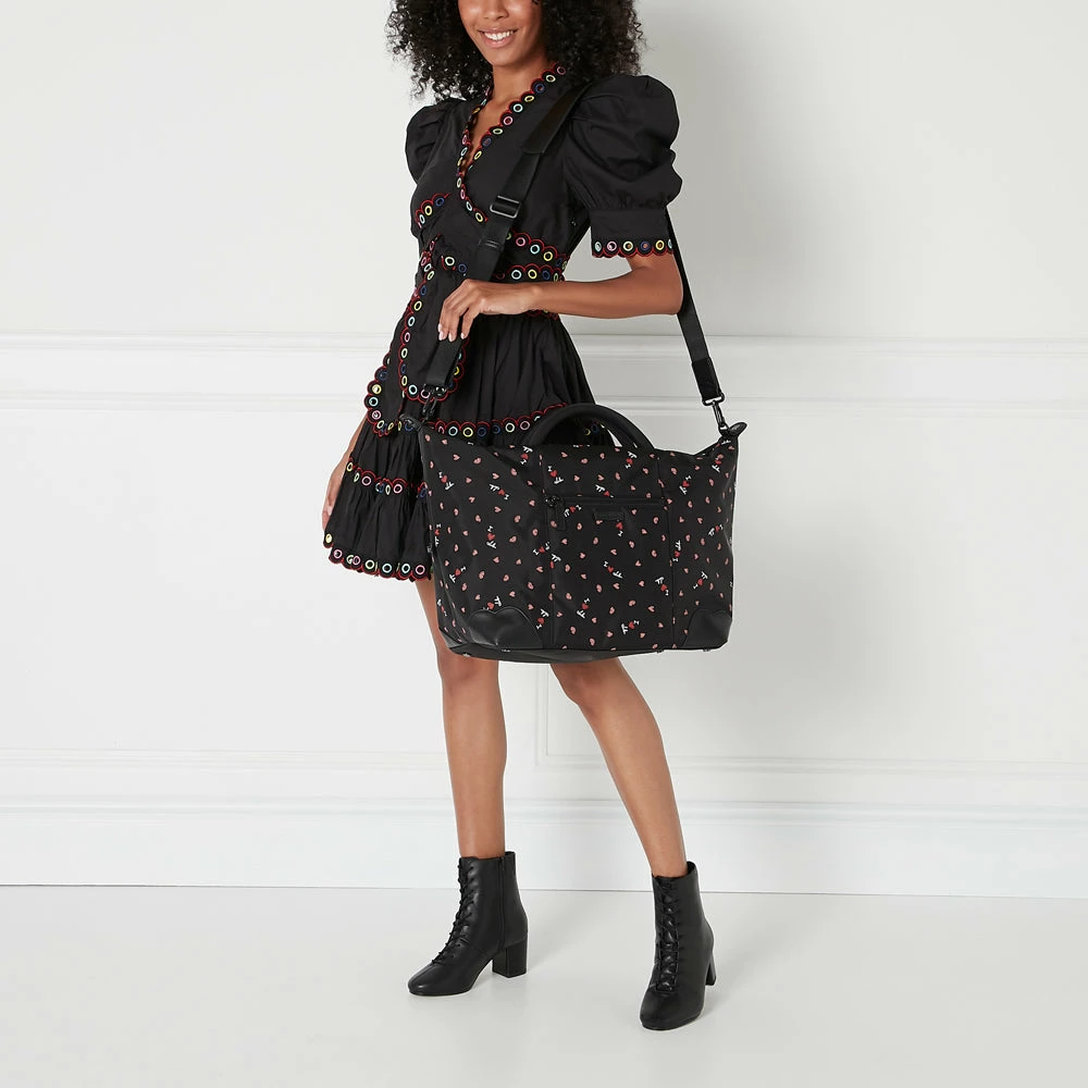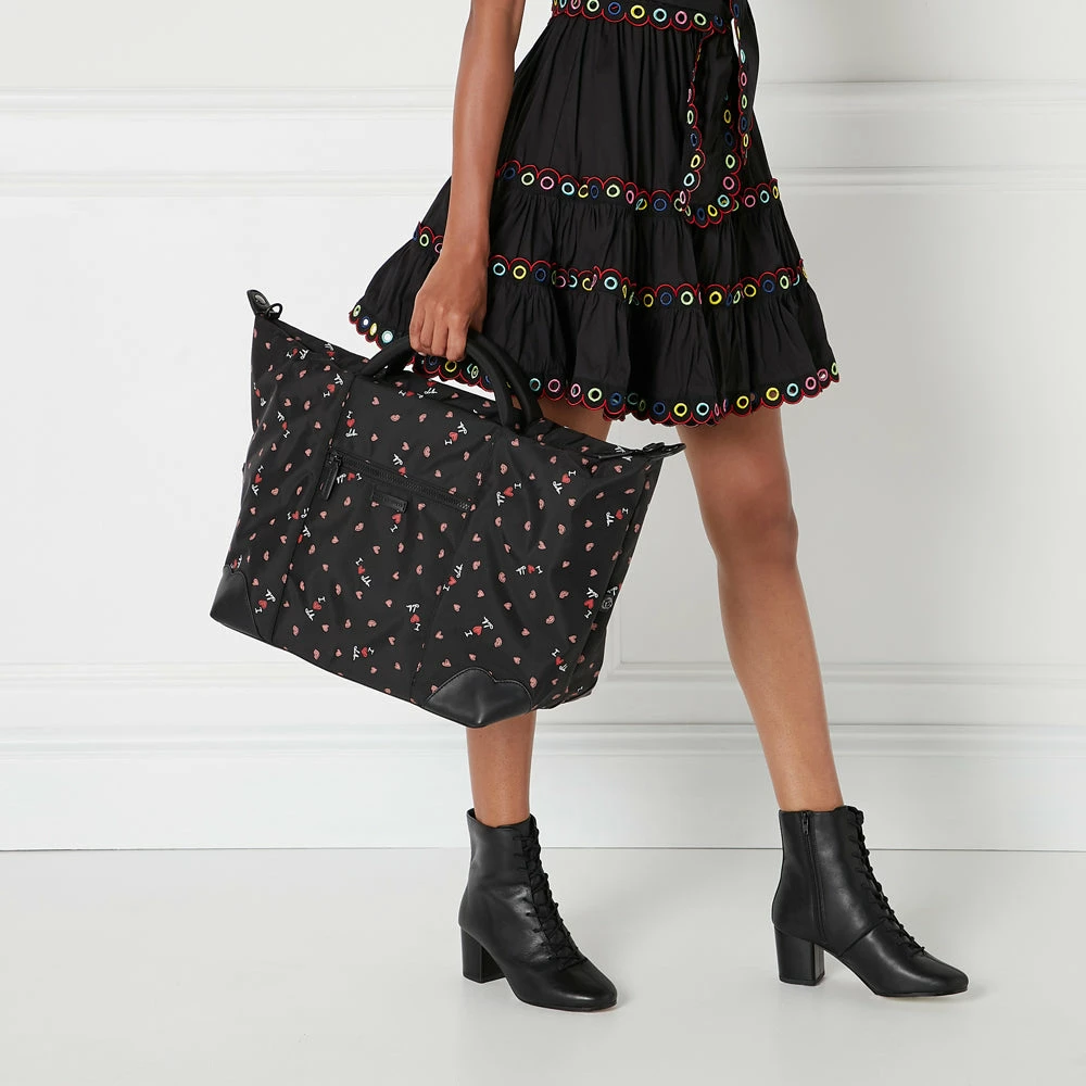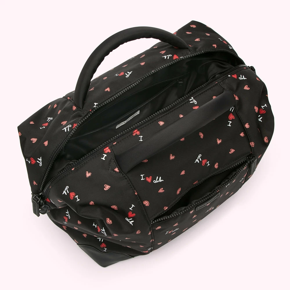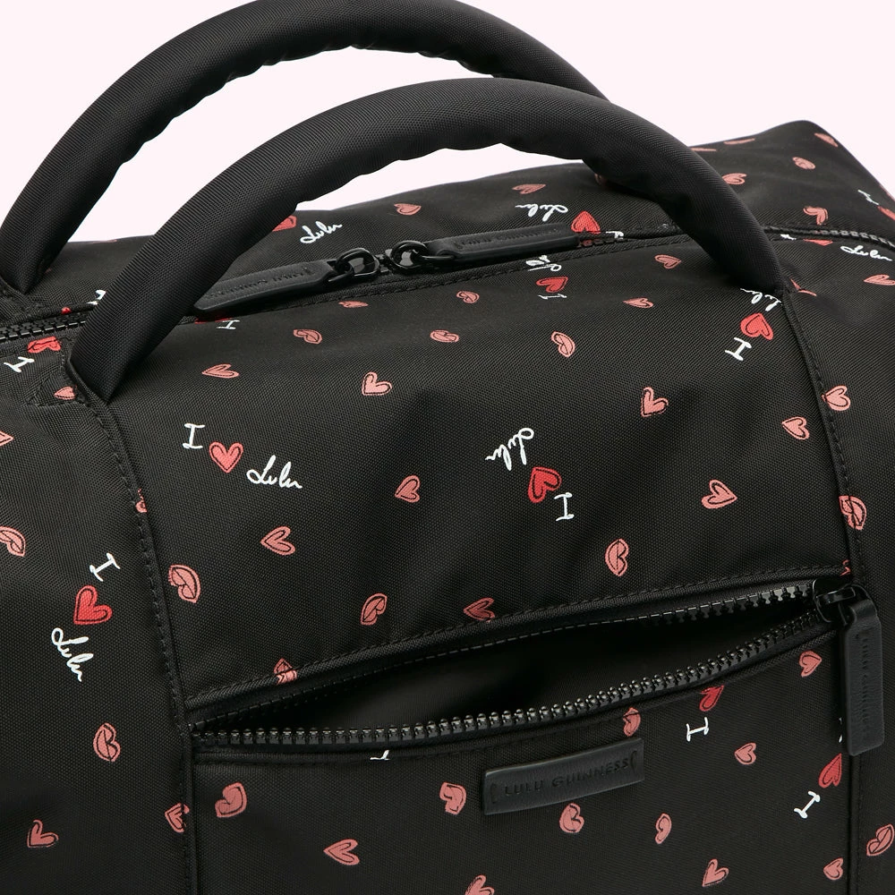 Get away with our soft-case Fenella overnight bag featuring signature ‘I Love Lulu’ design. Spacious enough to fit weekend essentials, this chic holdall features poppers on both sides for extended internal room and a detachable strap.