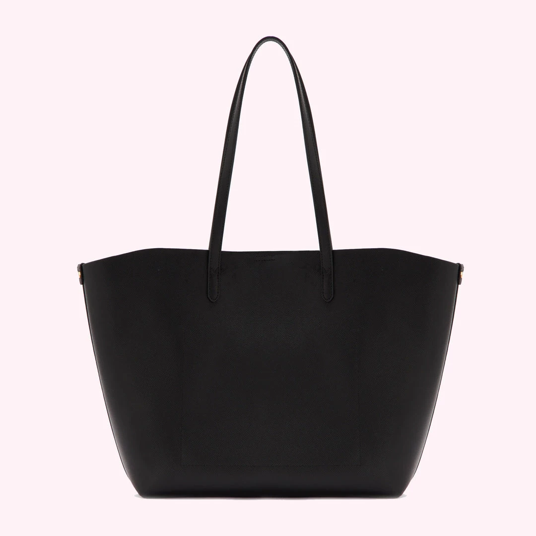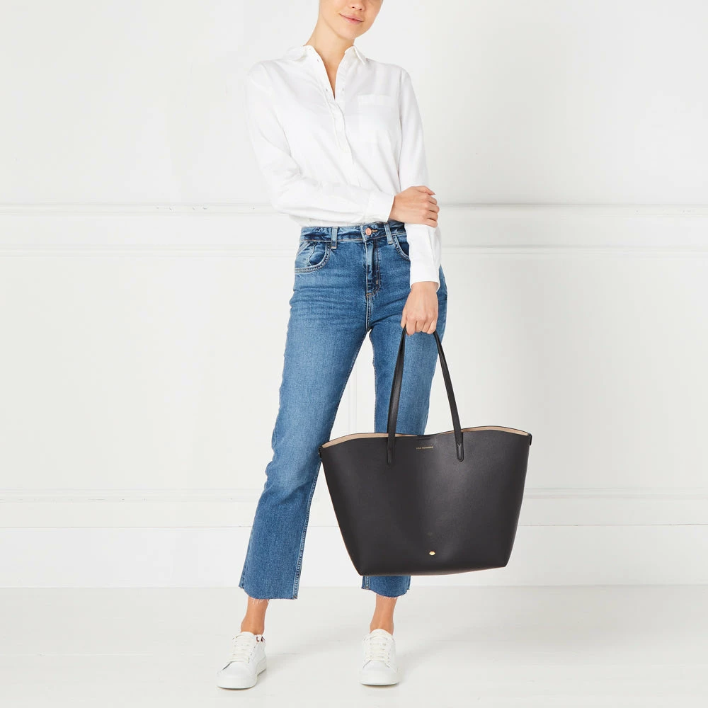 Carry it all with our spacious Ivy tote in black. Crafted from lightweight leather she features a soft structure, gold lip pin detail on front, internal slip pocket and ultra soft biscuit beige lining.
