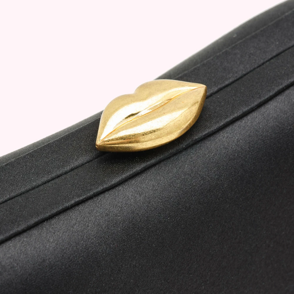 Petit, chic and just like Rita, our black satin Hayworth clutch is the epitome of old-school Hollywood glamour. Perfectly proportioned to fit all your essentials, this sleek evening bag has a makeup mirror, removable lip charm cross-body chain and signature lip clasp in antique gold.