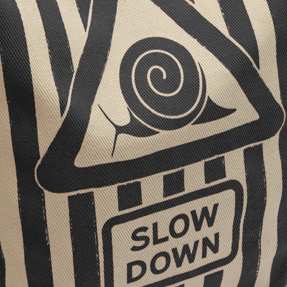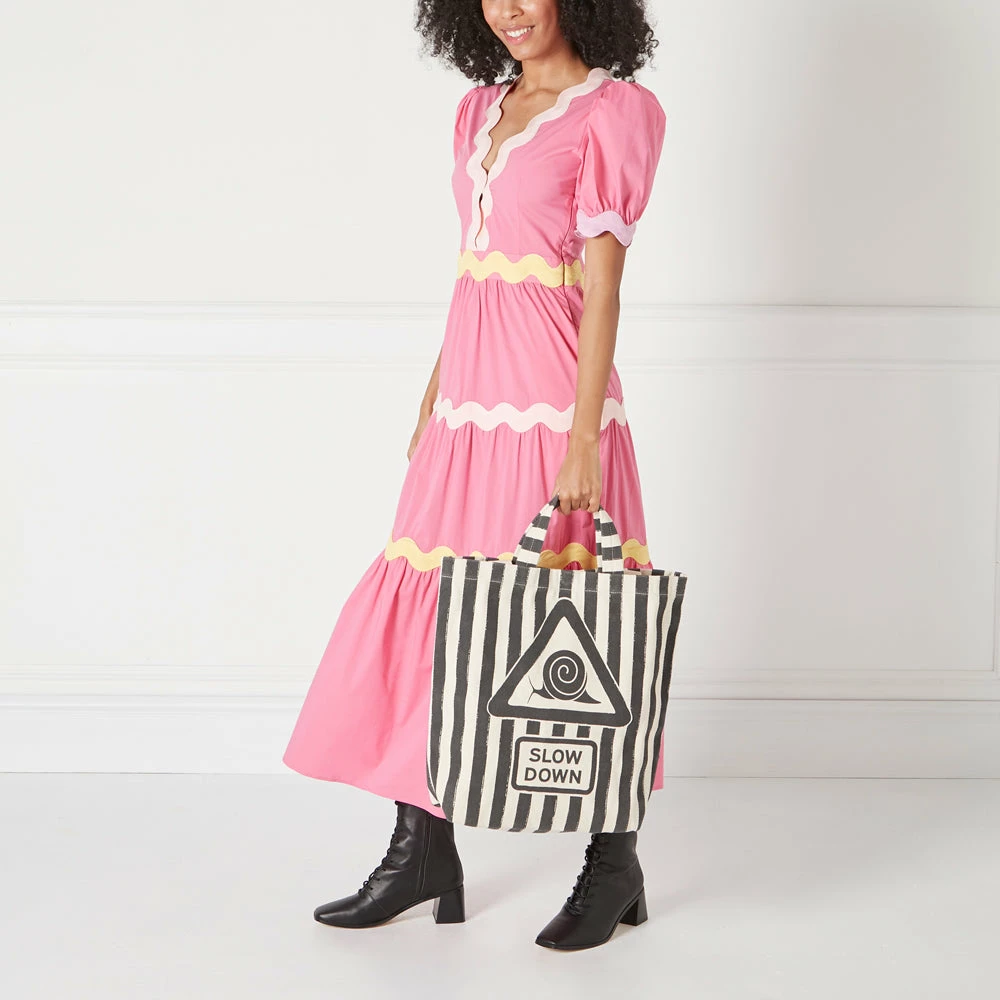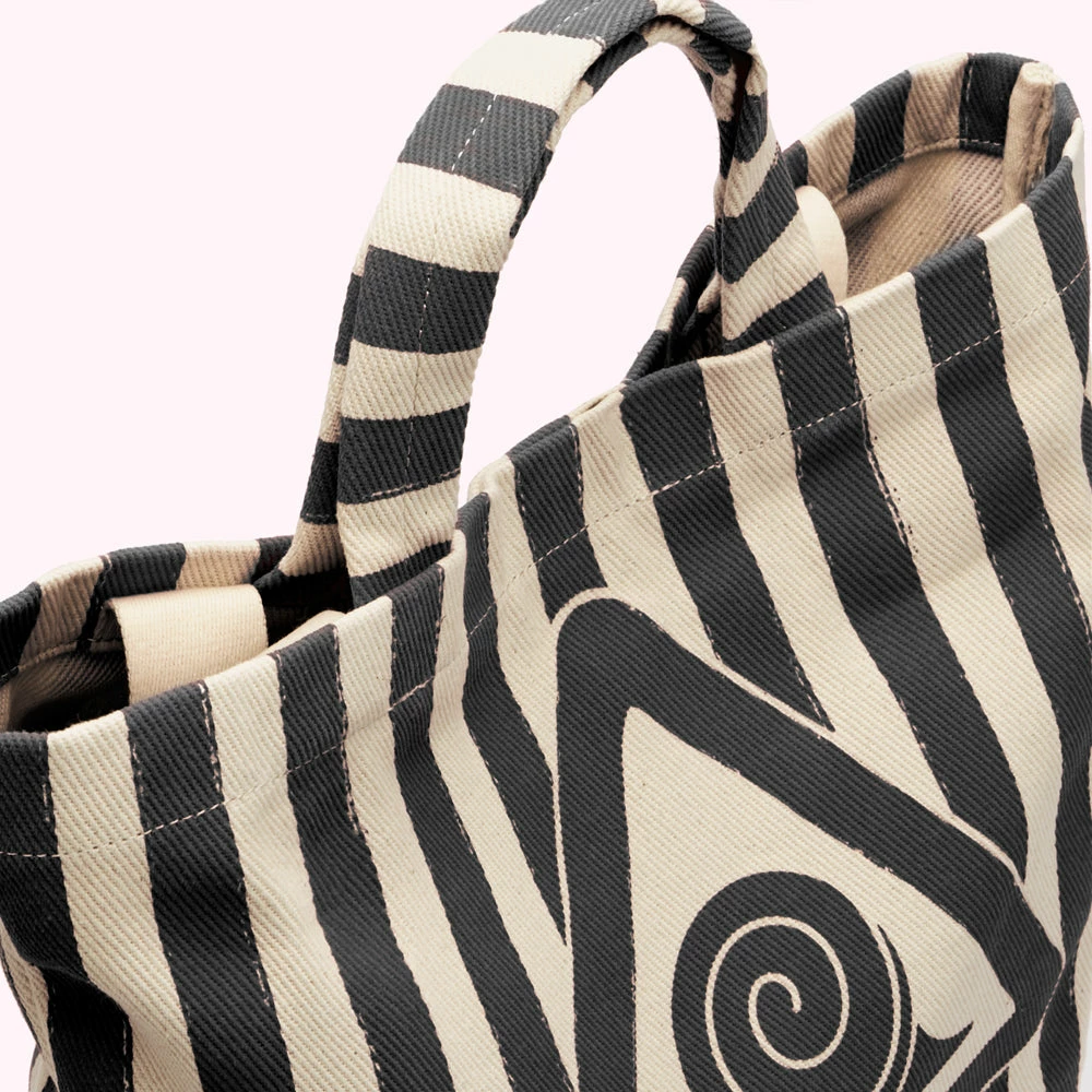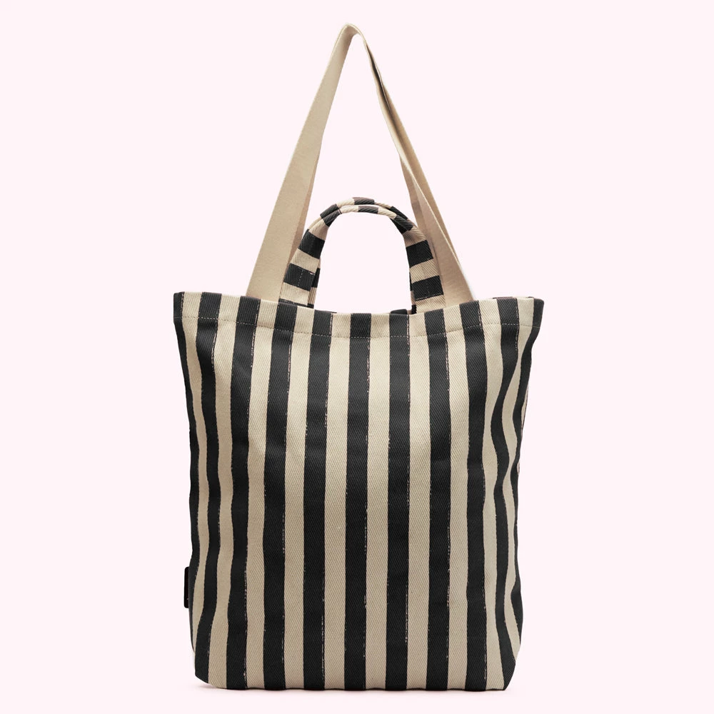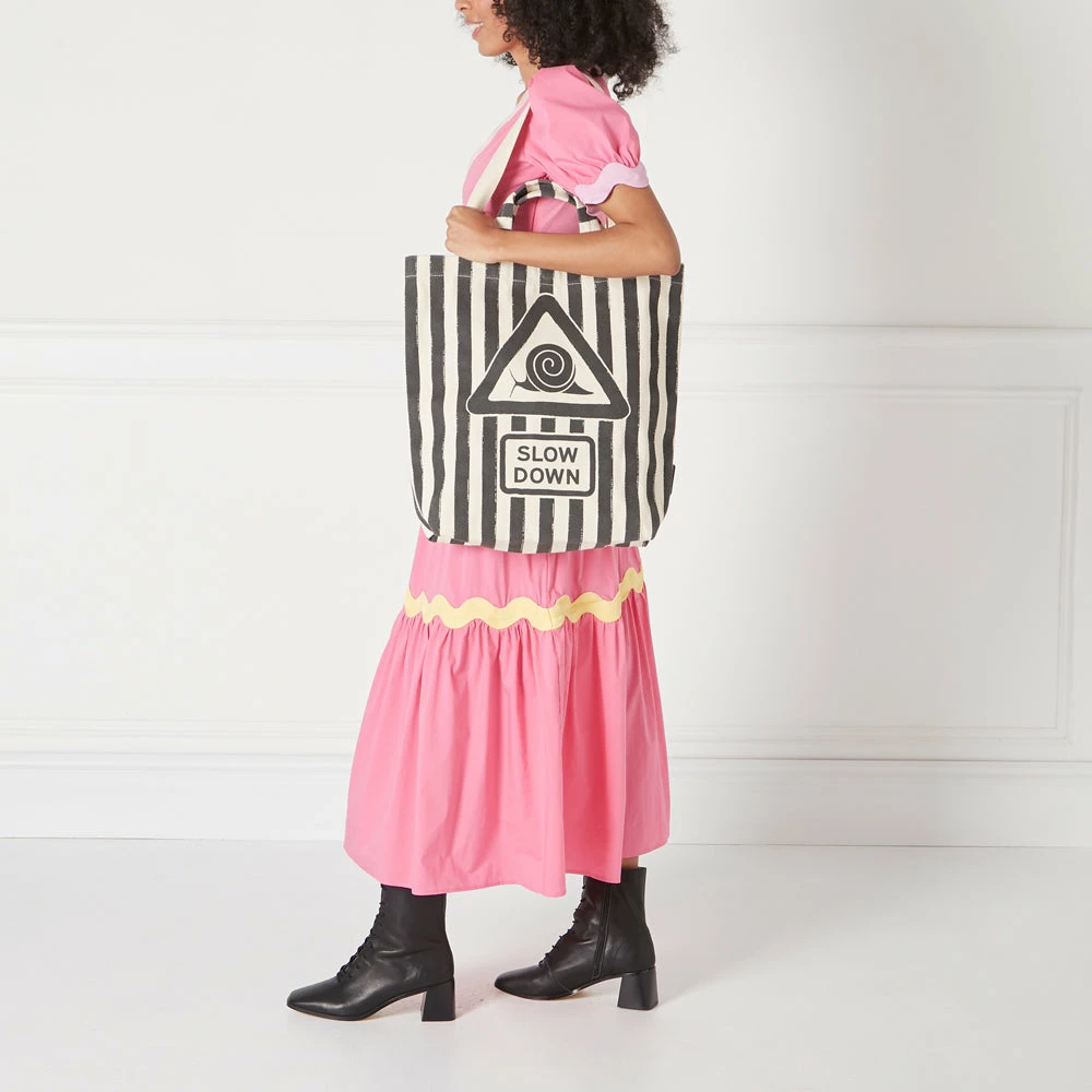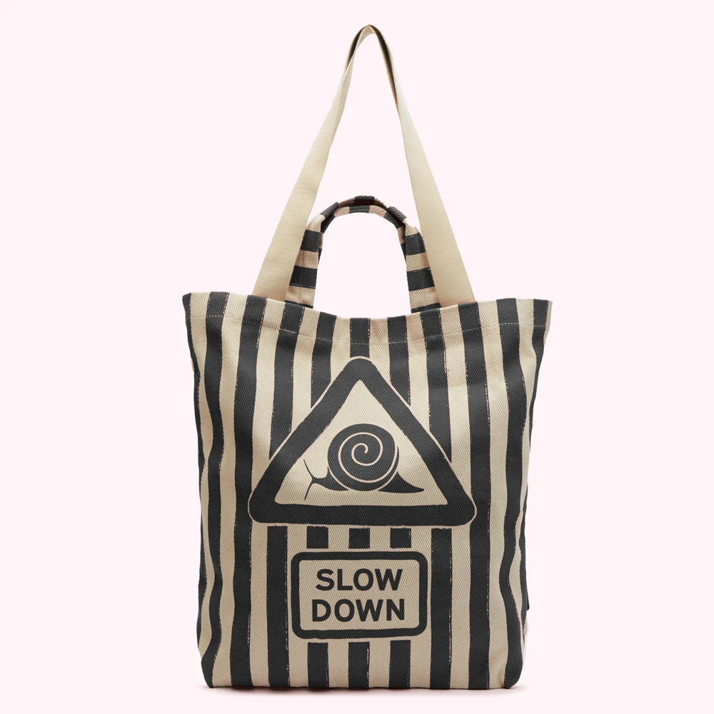 Remind yourself to slow down with this playful slogan Jean Tote in signature Black stripes. It makes the perfect casual weekend bag for running errands or impromptu park visits.