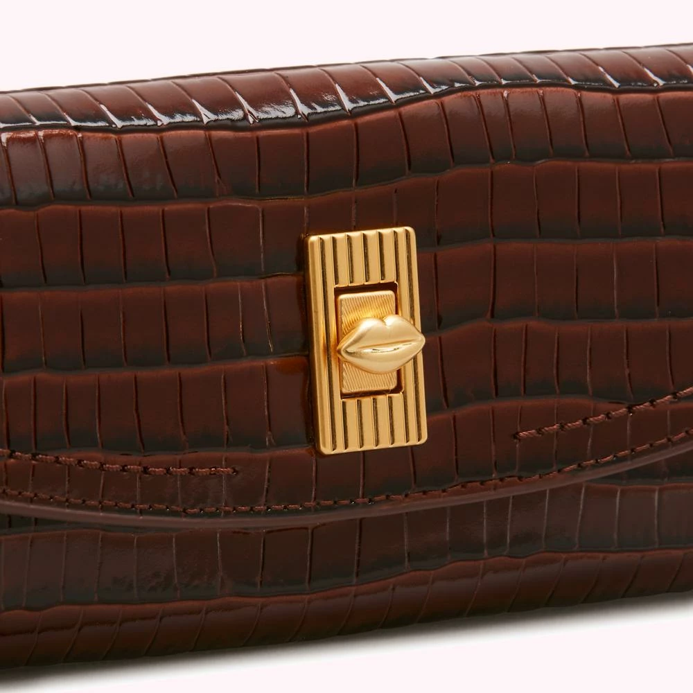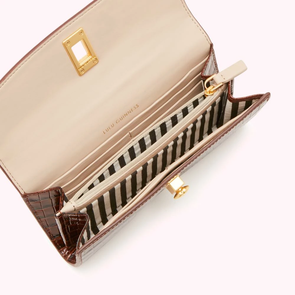 She’s the classic wallet with something special – that deco-inspired lip turnlock fastening. Crafted from chocolate croc-effect leather, this luxury everyday essential includes space for 12 cards and a zipped compartment for change.