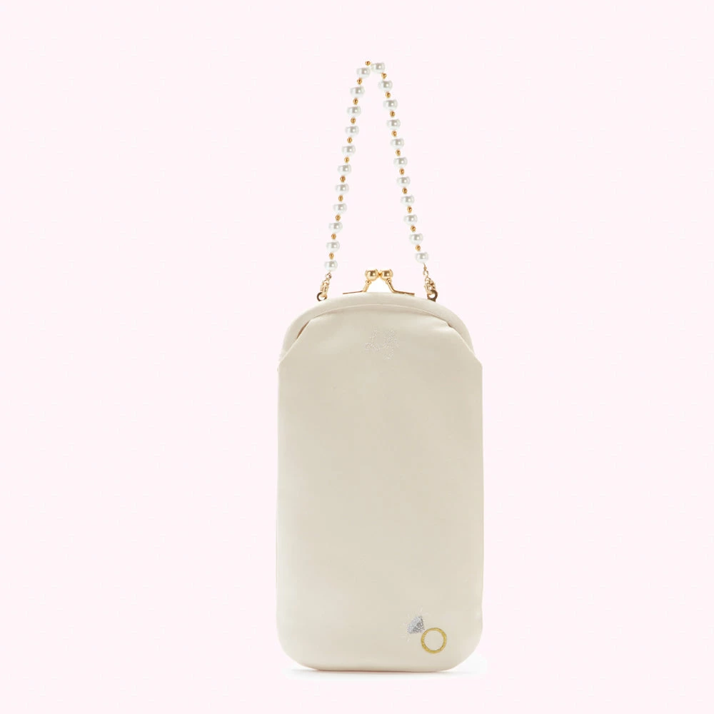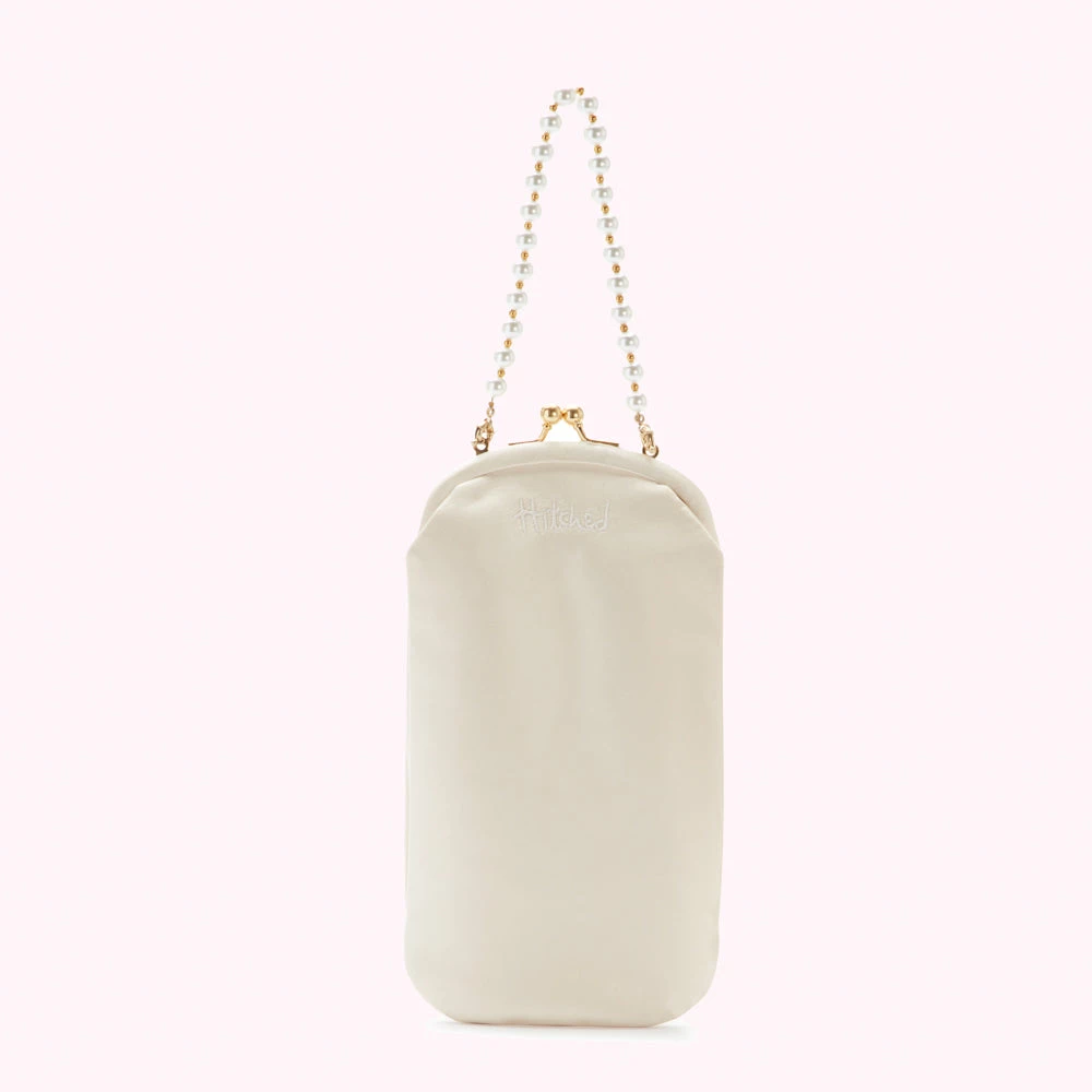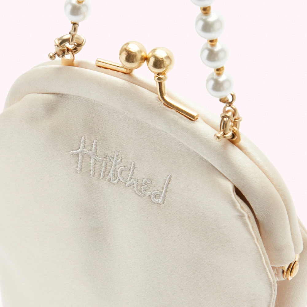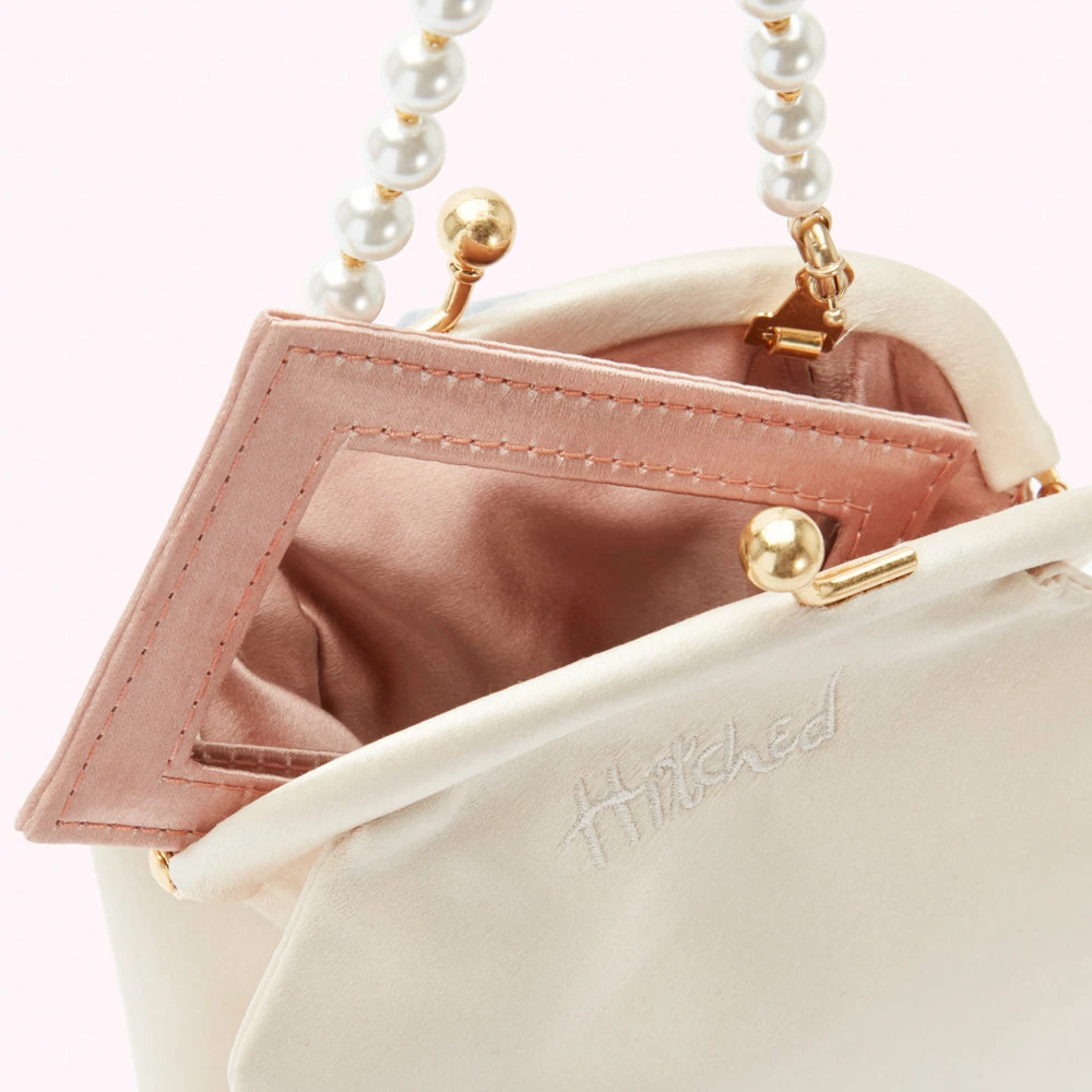 In Ivory satin, with a detachable faux pearl strap, mini mirror and room for your phone, this is your perfect tongue-in-cheek wedding purse. Named after Hollywood icon Jean Harlow, carry this retro frame style on your big day and beyond, and you’ll have your pearls of wisdom with you, too.