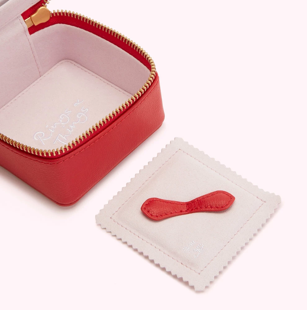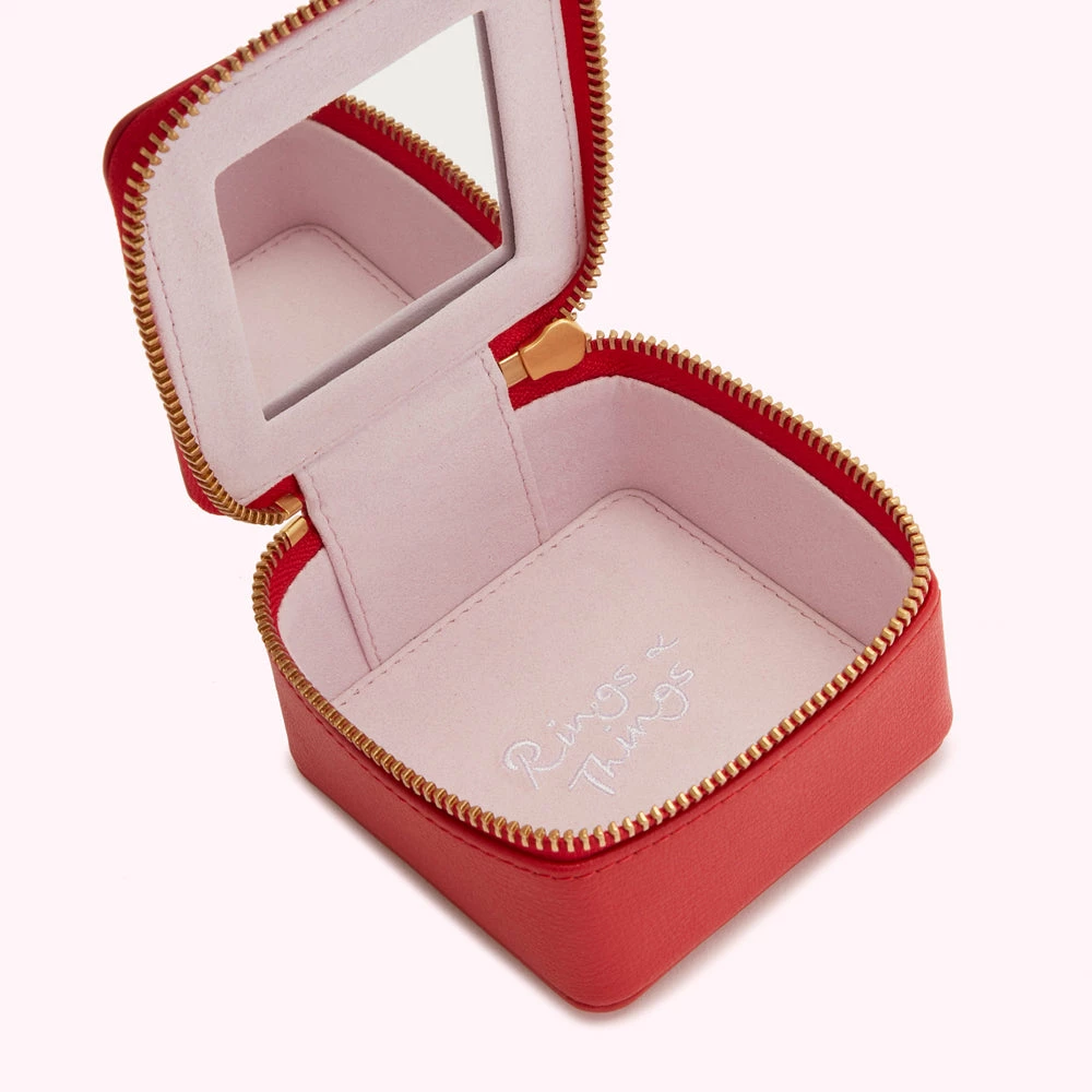 The perfect gift for jewellery-loving friends, our Lulu Red zip-around jewellery box is lightweight and perfect for travelling. Note the playful detailing with internal mirror and ‘Rings and Things’ embroidery.