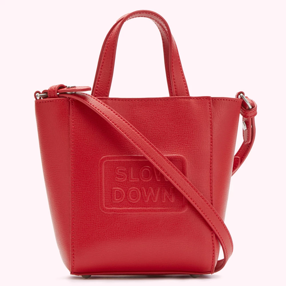 With signature British wit, Bibi is your quintessential talking-point tote – updated with Lulu’s new ‘Slow Down’ mantra in signature Red.