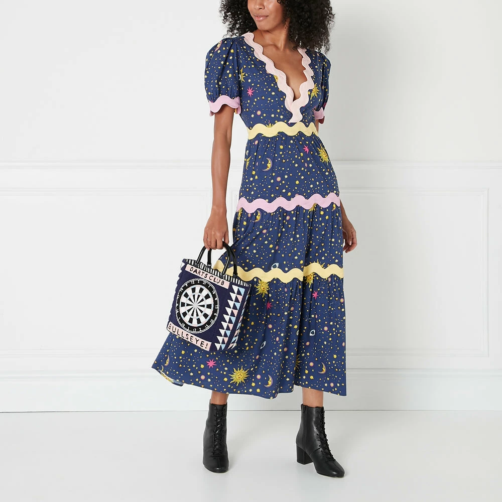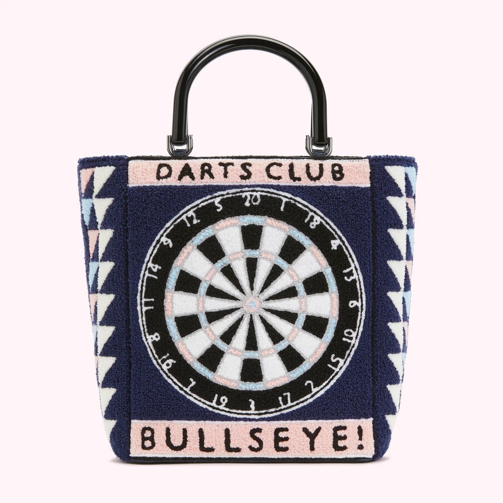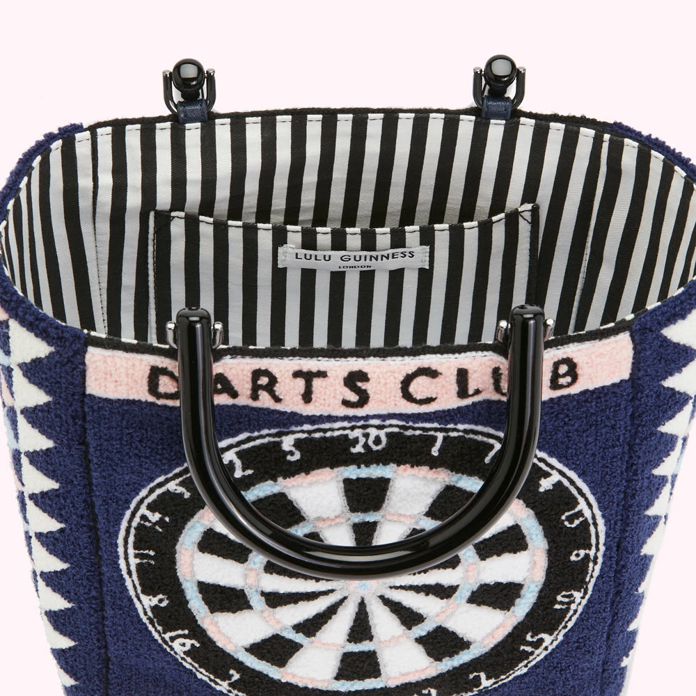 With signature British wit, Bibi is your quintessential talking-point tote. Updated in chic Navy, the statement Bullseye design is crafted from soft and textured bouclé, complete with chic black acrylic handles and monochrome striped lining.
