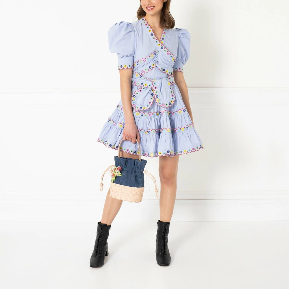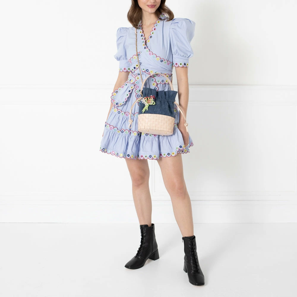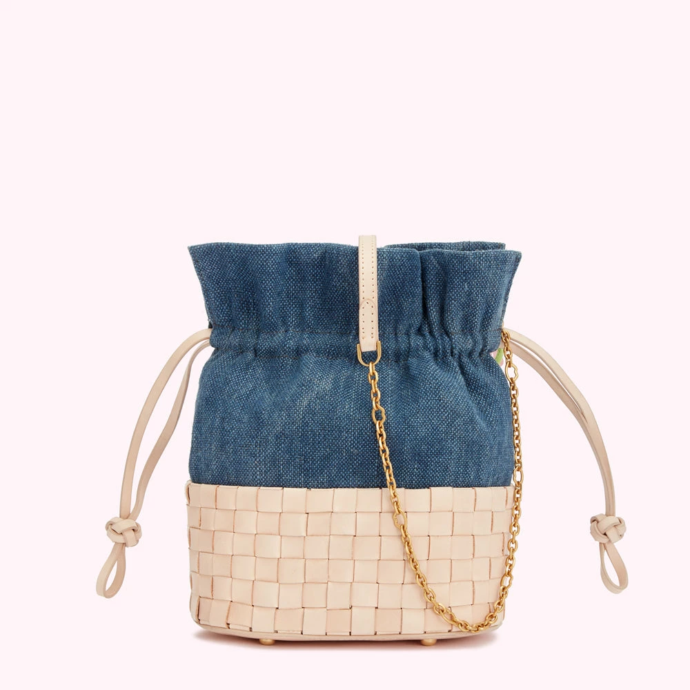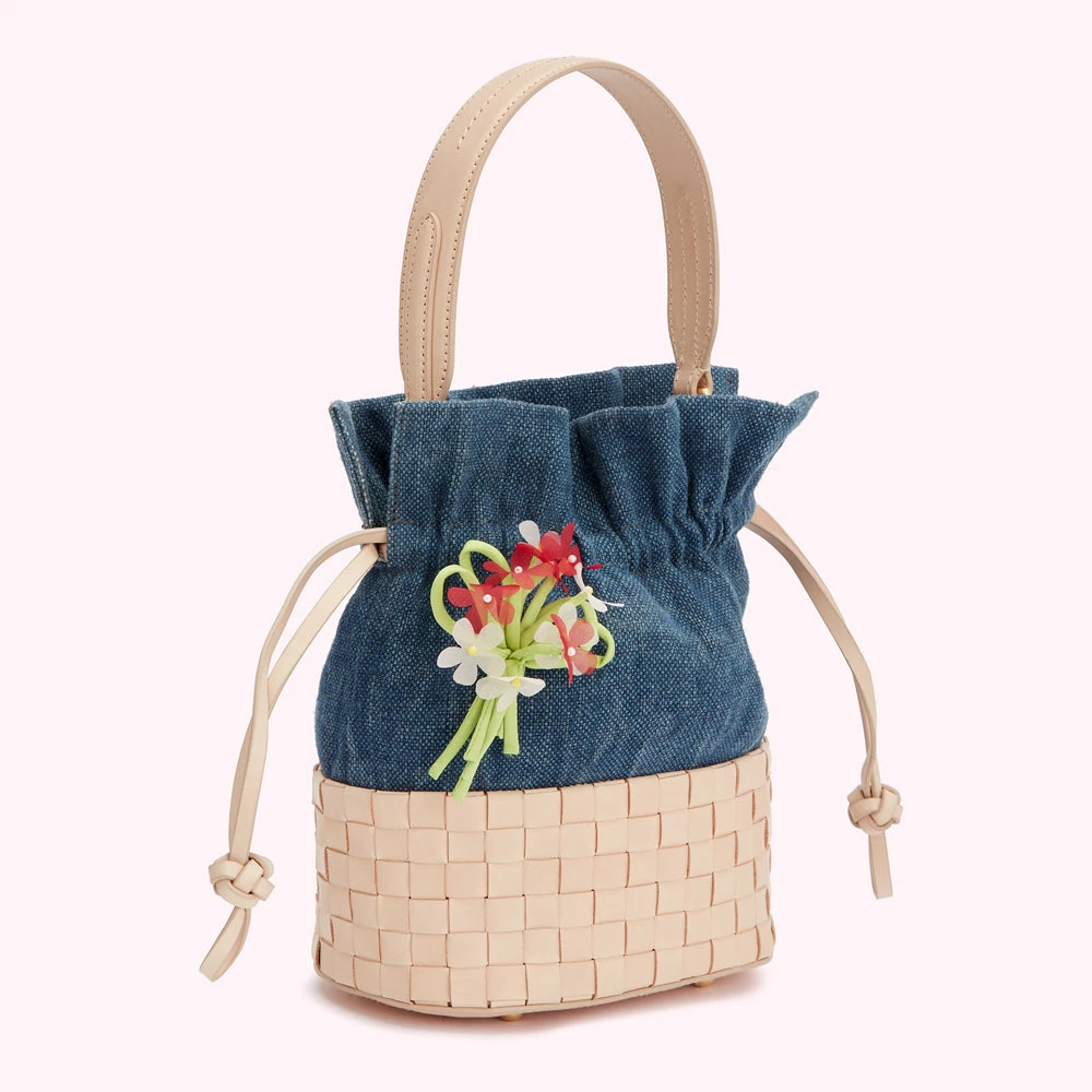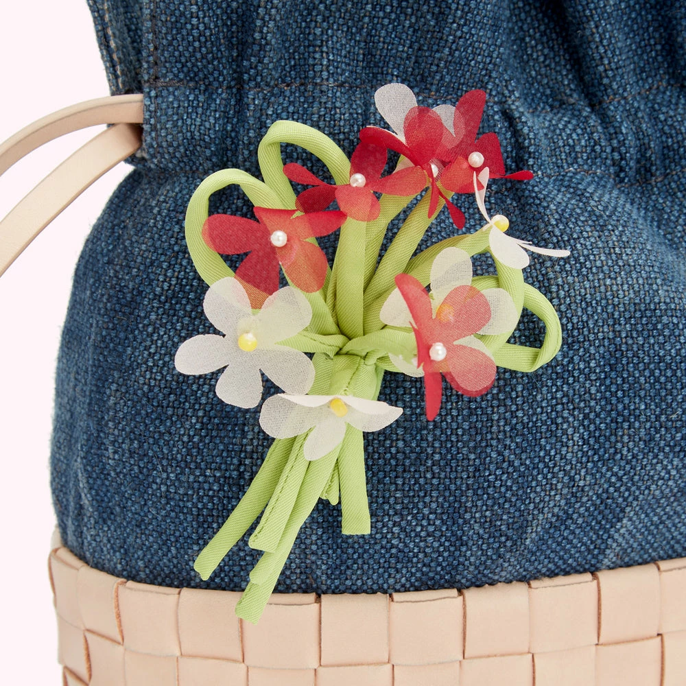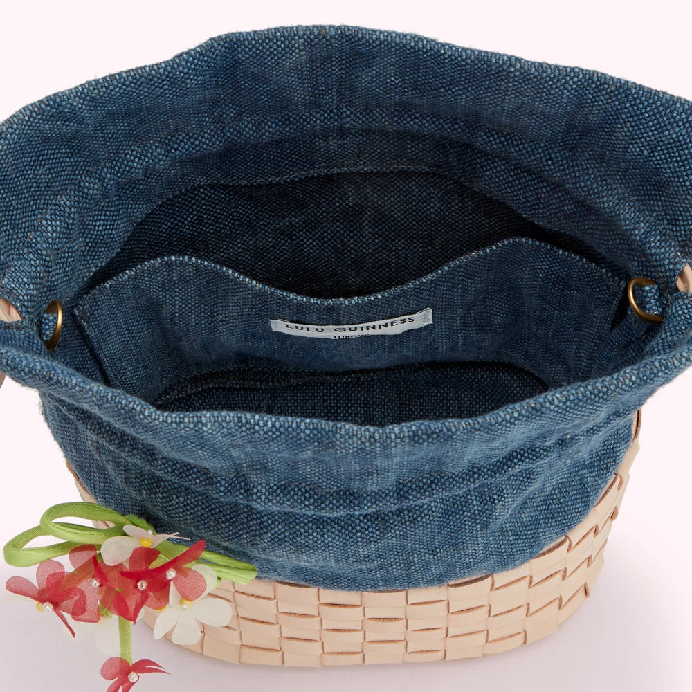 Crafted from woven vegetable leather and Navy canvas, this multi-textured Eloise Basket Bag – complete with pretty removable corsage – is the perfect summer party piece. Carry to add a whimsical finish to your look.