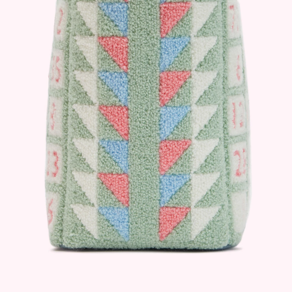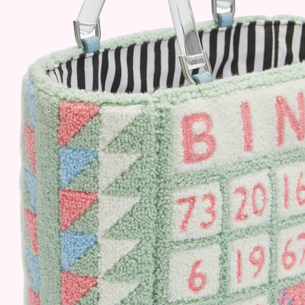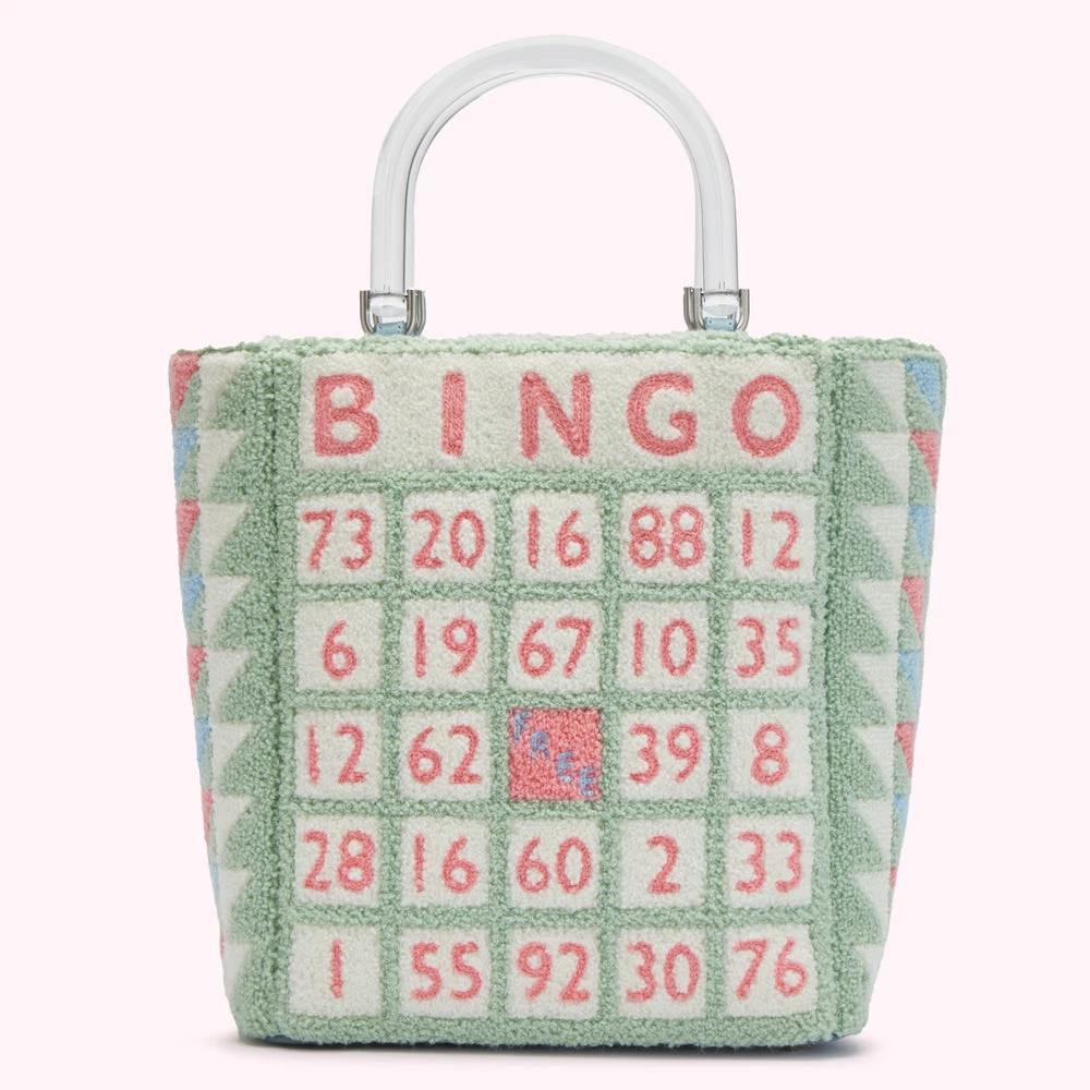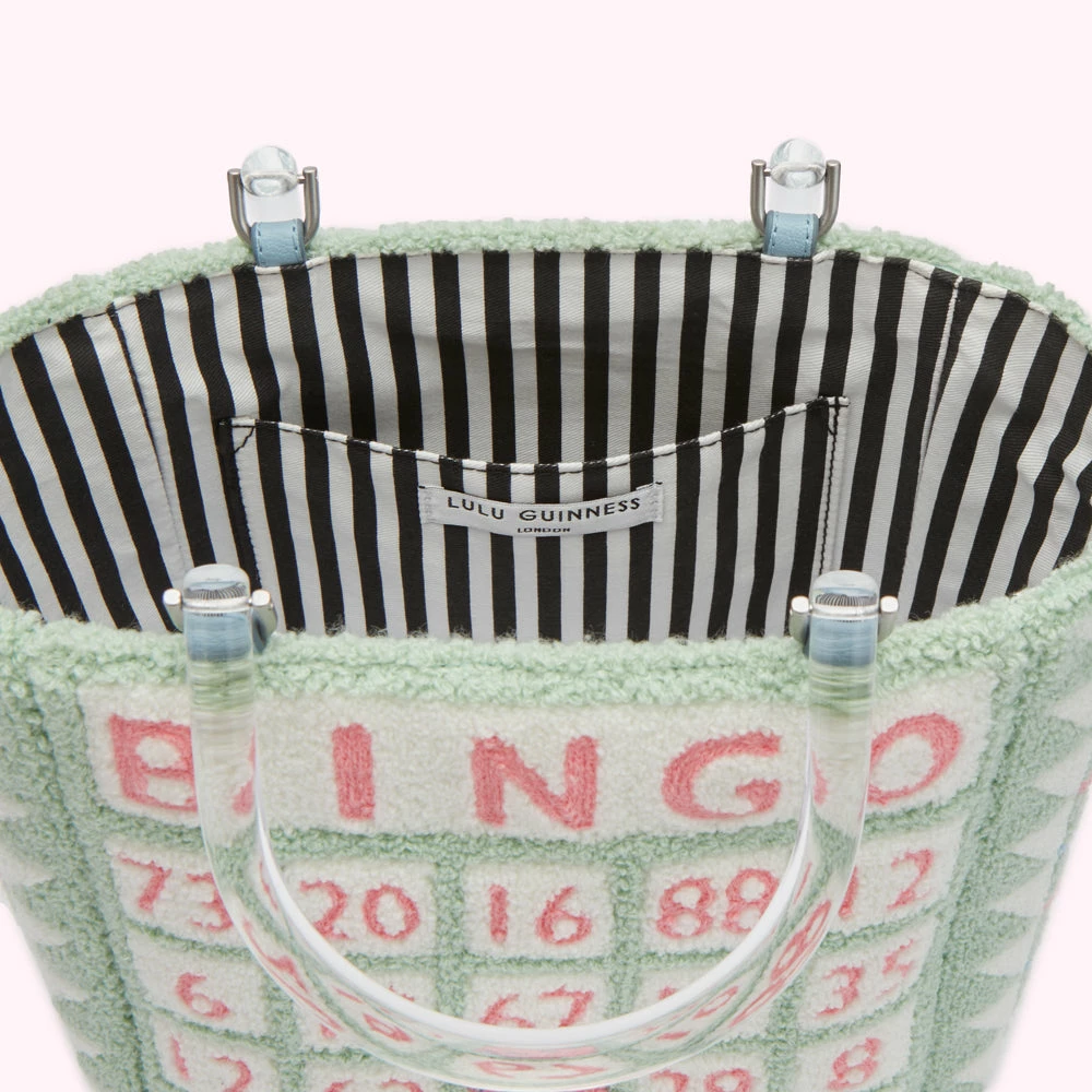 Inspired by designs from the Lulu archive, our Pistachio Bibi tote encapsulates quintessential British charm. Crafted from soft and textured bouclé, she features Bingo board design, chic clear acrylic handles, vertical stripe lining and internal slip pocket. Will you take a chance on her?