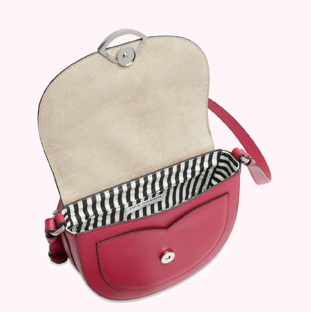 Embrace the timeless appeal of the modern saddle bag with our statement Raspberry Esme. Crafted from premium leather, she features signature Lulu detail with gold cut out lip clasp and Cupid’s bow detail on reverse pocket.