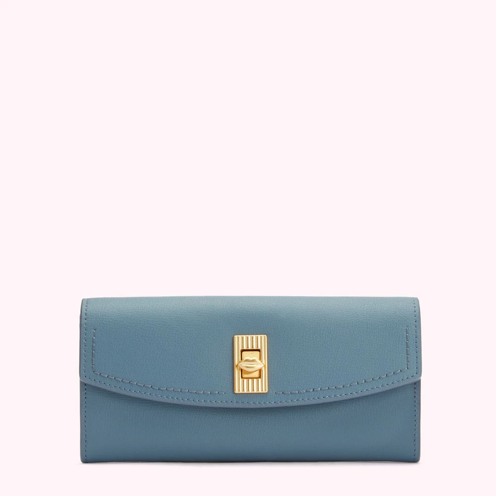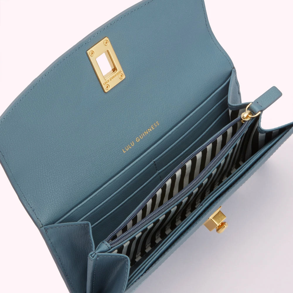 In Seal blue, Lucia is the classic wallet with something special – that deco-inspired lip turnlock fastening. Crafted from premium leather, this luxury everyday essential includes space for 12 cards and a zipped compartment for change.