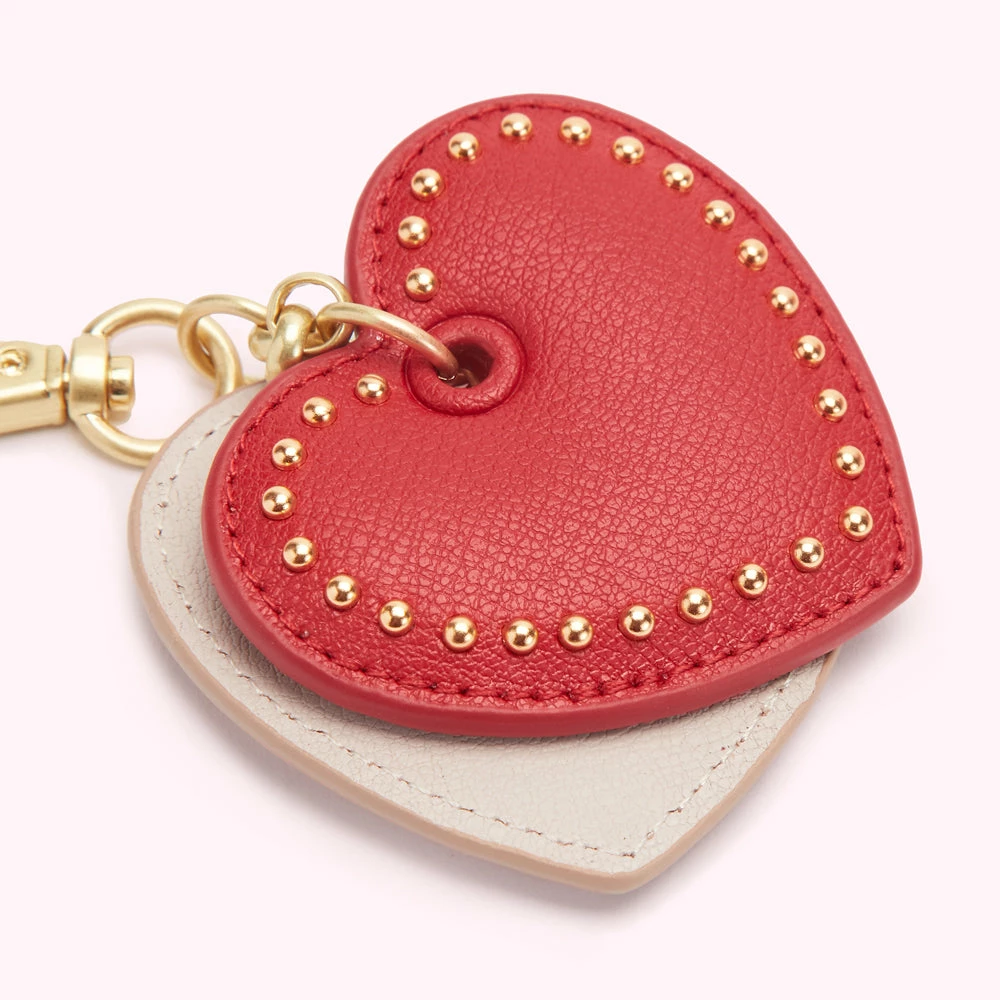 Wear your heart on your bag with this Lulu Red and Blush leather studded heart keyring – it makes the perfect Valentine’s gift.
