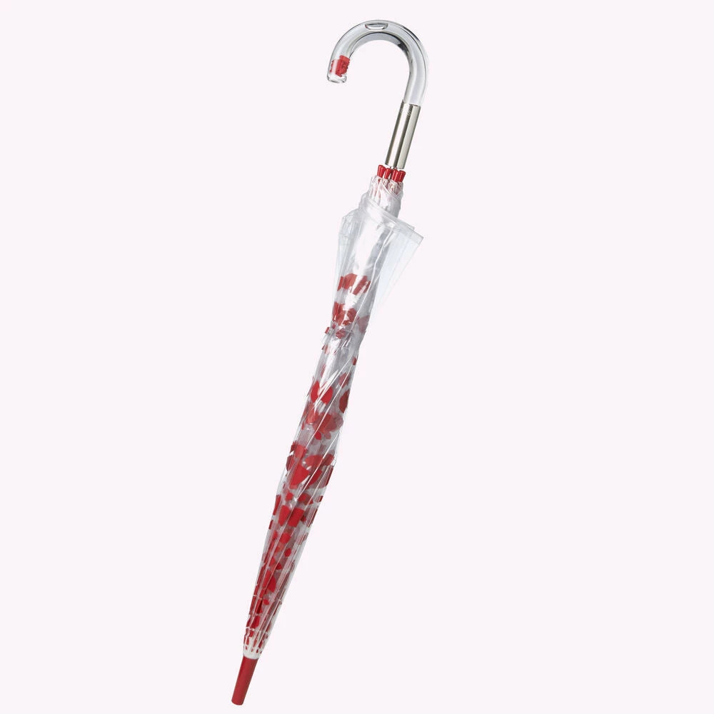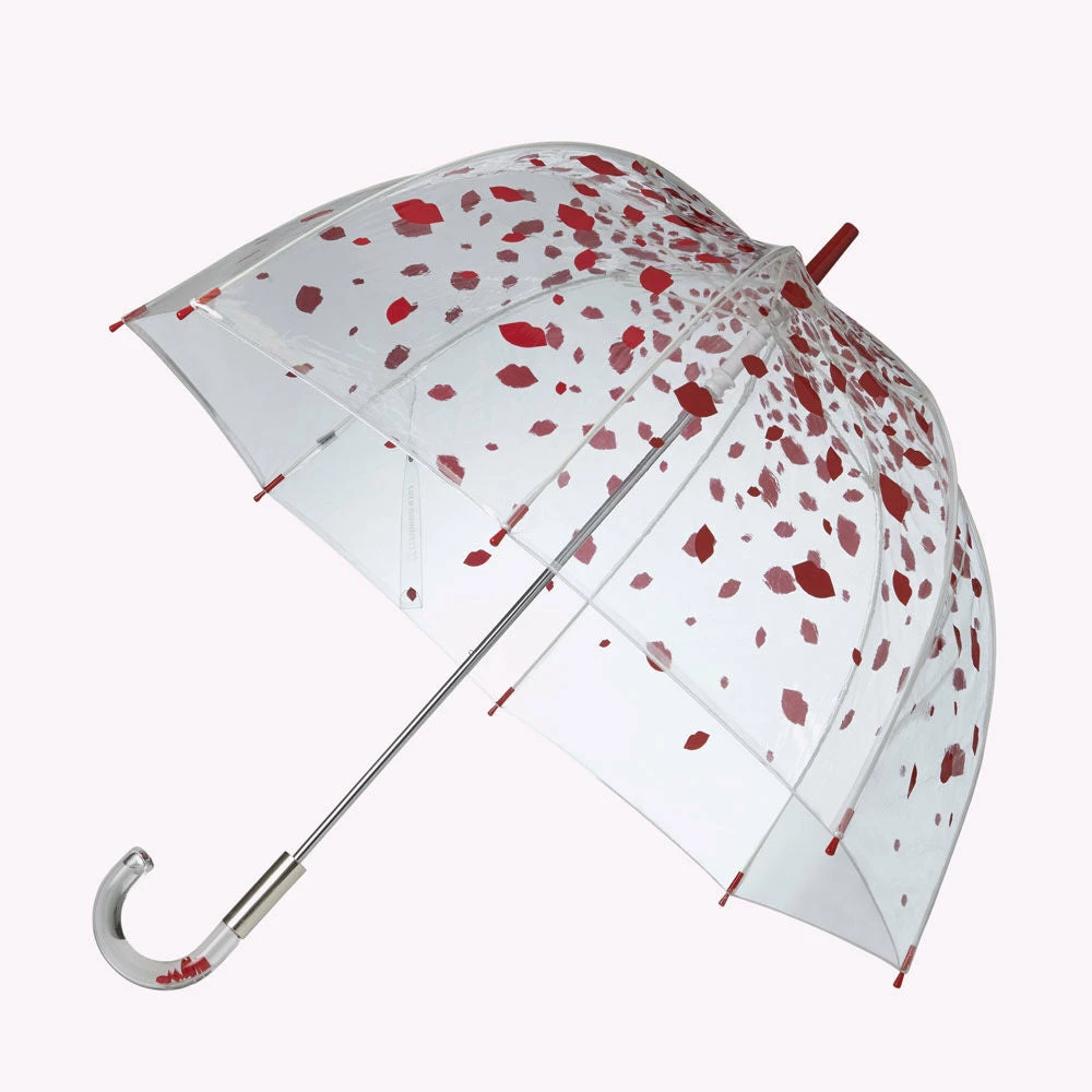 Clear birdcage umbrella with red raining lips design featuring clear curved handle with playful floating lips inside.