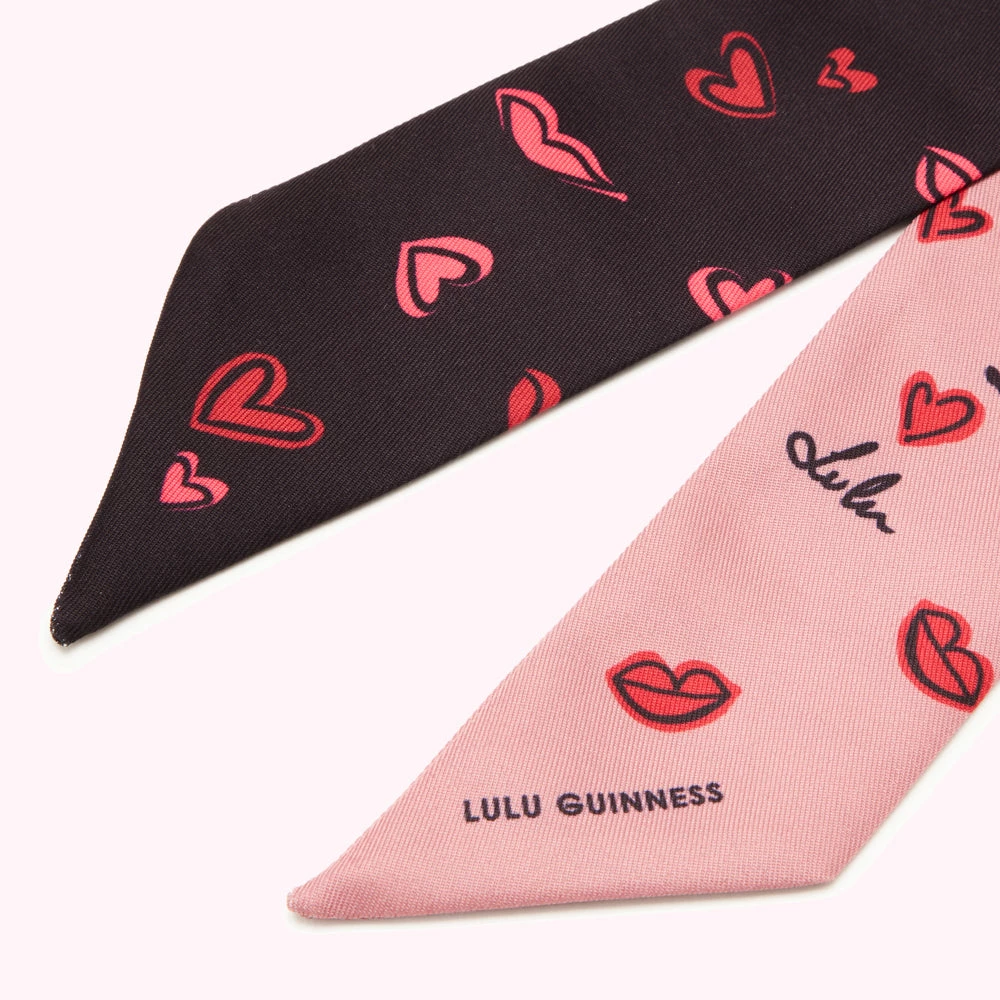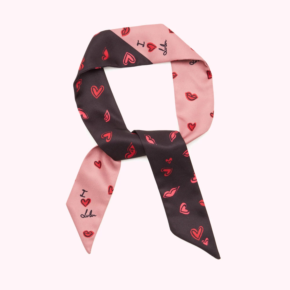 Stamped with signature Lulu hearts, every chic wardrobe needs a skinny scarf to dress your neck or your bag. This black and honeysuckle style will add a playful twist to everyday looks.