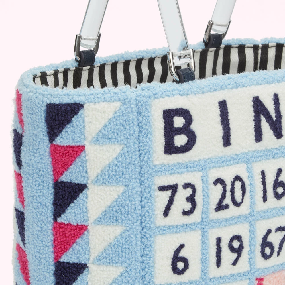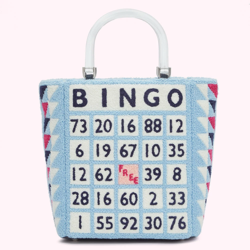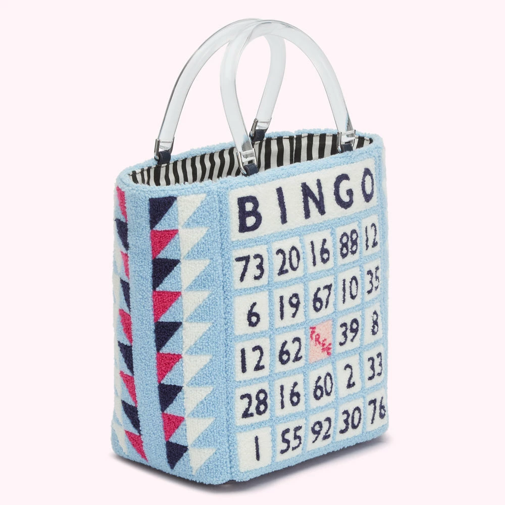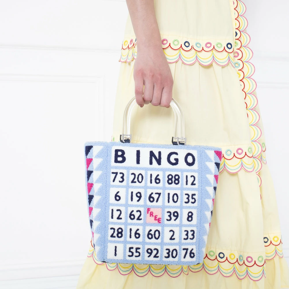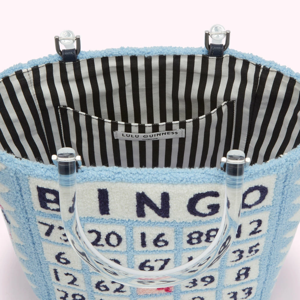 Inspired by designs from the Lulu archive, our Wedgewood Bibi tote encapsulates quintessential British charm. Crafted from soft and textured bouclé, she features Bingo board design, chic black acrylic handles, vertical stripe lining and internal slip pocket. Will you take a chance on her?